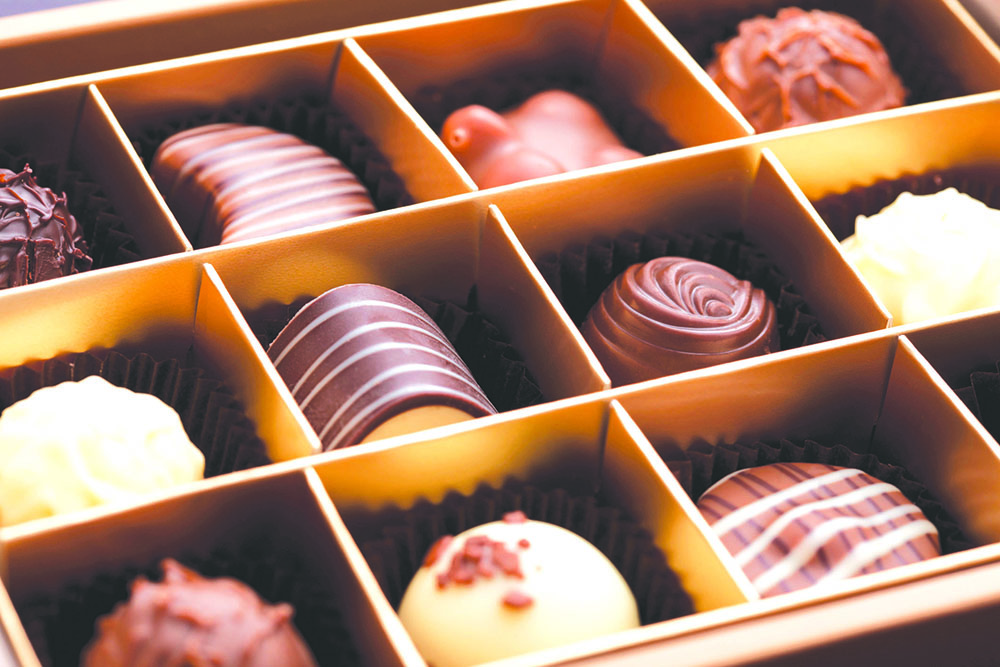 Macro close-up of a gift box of gourmet chocolates.