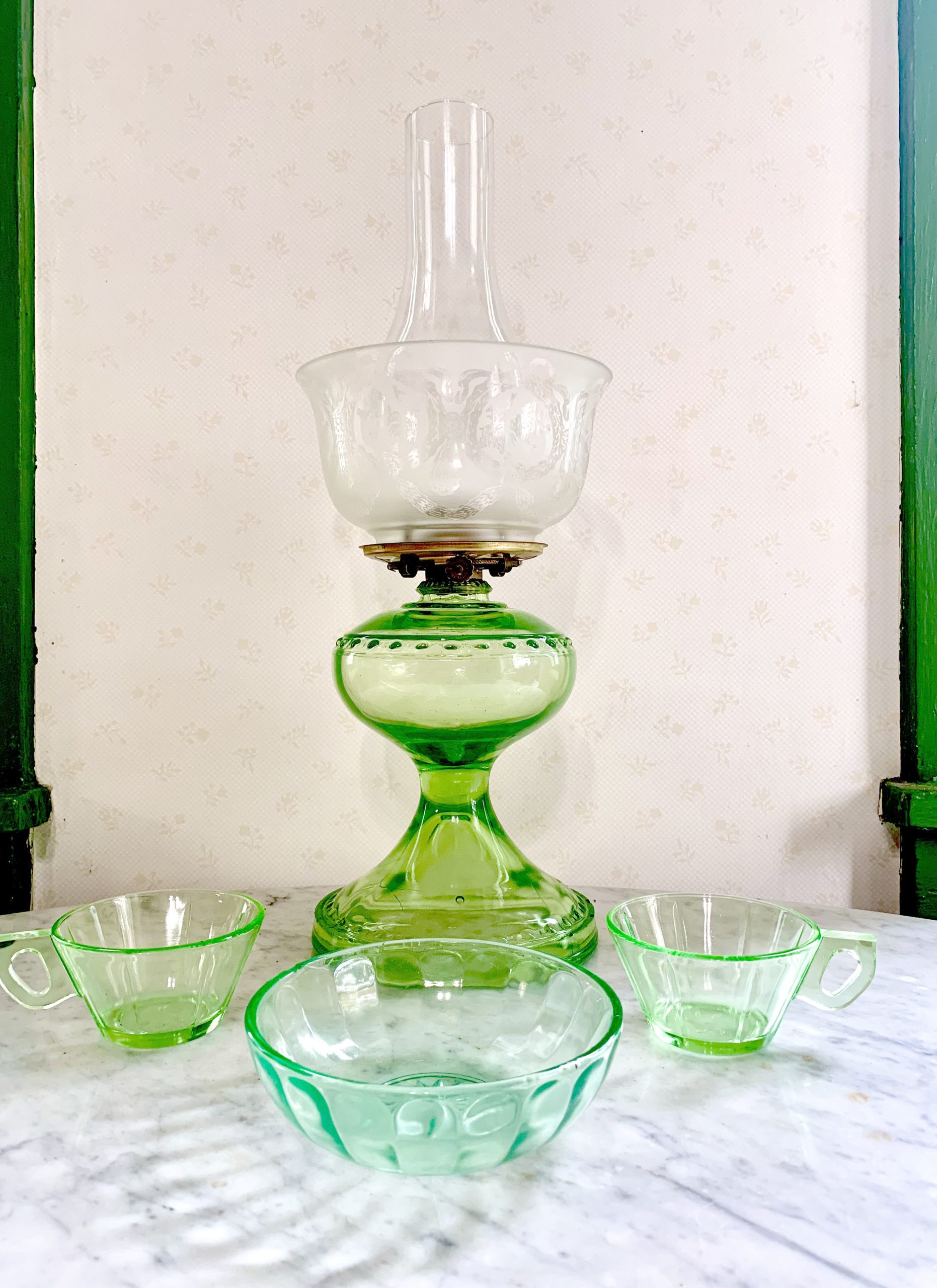 The small collection shown in this photo is on display in the front parlor of the Greene County Historical Society Museum and contains pieces such as small cups, a bowl and a decorative kerosene lamp that all date to the late 19th century. A few other small pieces of uranium glass are on display throughout the room as well.