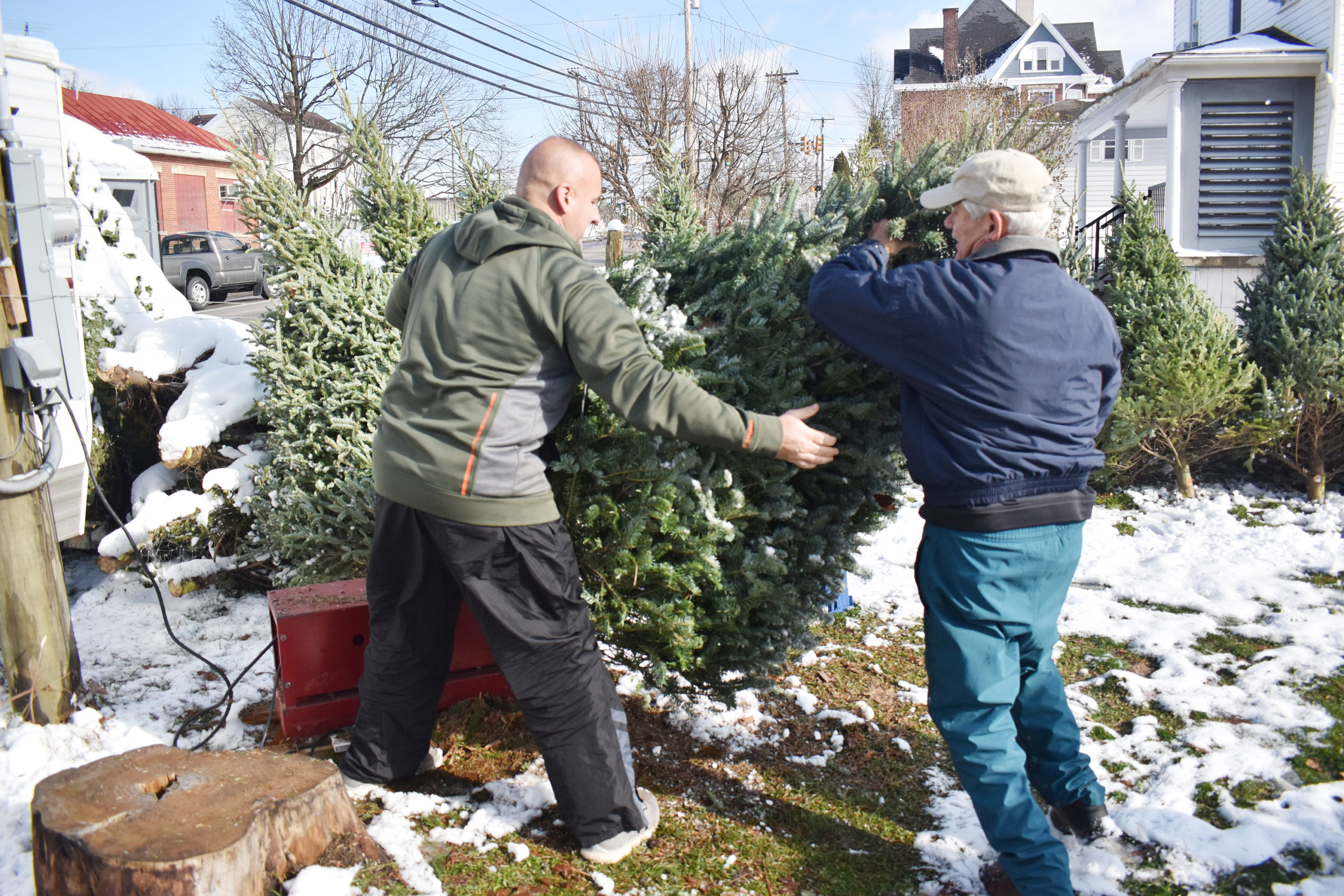 The Saturday after Thanksgiving, Mussers Farm, which resides in Indiana, Pennsylvania, drives a truck laden with Christmas trees to the Lions Club’s designated spot and has since the 1970s, Tom shares. The trees are mixture of Canaan and Fraser Firs. As the truck arrives, a myriad of Lions Club members and volunteers await to unload the trees.