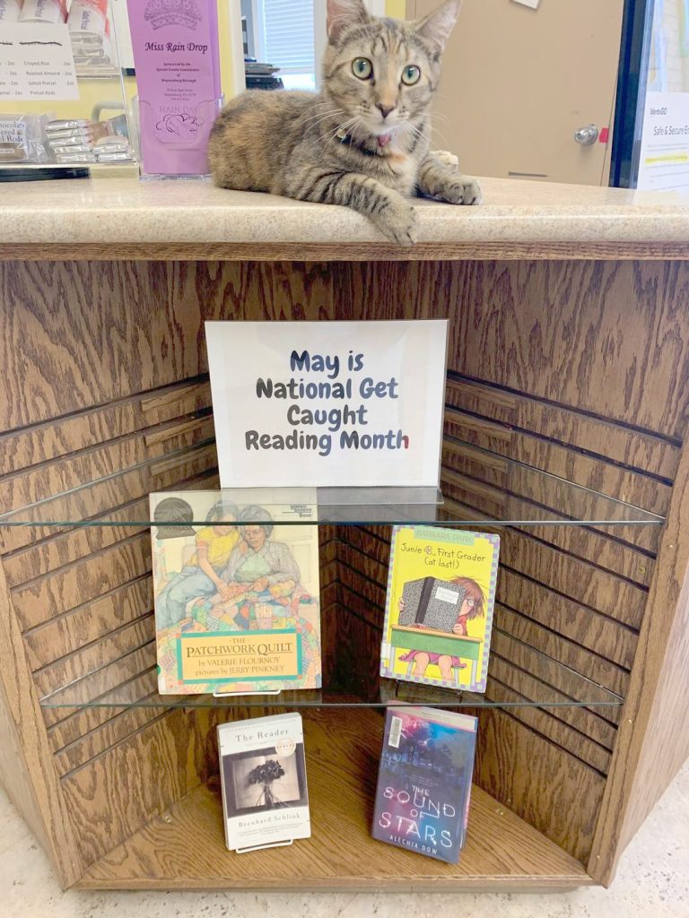 Nicole says that the cats make wonderful companions at the library, especially for older patrons. Many patrons don’t get out much to socialize, and Jane is especially beloved by seniors in the community. Both cats cultivate a “stay awhile” attitude at Flenniken. Nicole shares that “on several occasions, [a patron’s] bag is too heavy when they go to leave…” We soon figure out why, as the ornery stowaway slinks out of her temporary hiding place in a purse or backpack. “Pets are scientifically proven to calm anxiety,” Nicole says, and this is apparent in patrons’ interactions with Harriet and Jane.