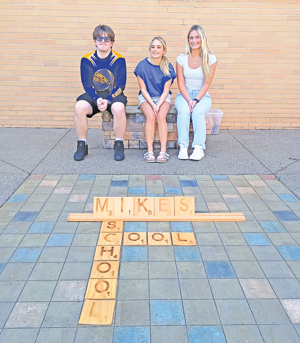 Three students sit on a bench behind a large Scrabble-style display spelling “Mikes School” on the ground.