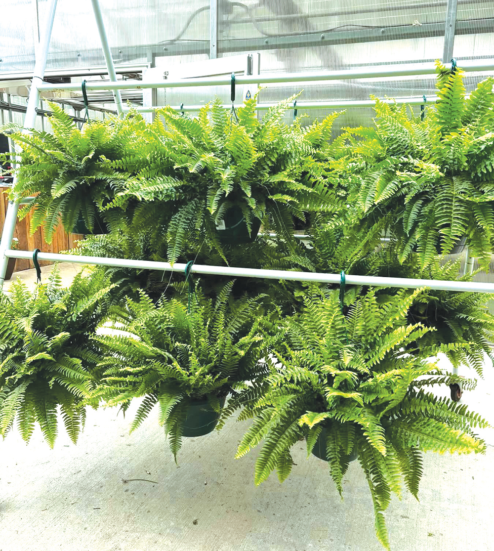 Hanging ferns fill a sunlit greenhouse with dense green foliage.