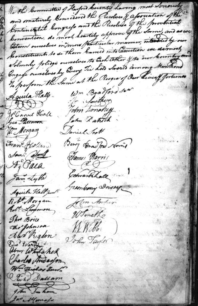 Leading up to the Second Continental Congress that met on May 10, 1775, the citizens of Harford County, Maryland elected a committee to decide their actions in the ongoing conflict. At Bush Tavern, in Harfordtown, Maryland, thirty-four men signed their names to a document stating that “We the committee of Harford County, having most seriously and maturely considered the Resolves and Association of the Continental Congress, and the Resolves of the Provincial Convention, do most heartily approve of the same, and as we esteem ourselves in a more particular manner, entrusted by our constituents to see them carried into execution, we do most solemnly pledge ourselves to each other, and to our Country, and engage ourselves by every tie held sacred among mankind to perform the same at the risqué of our lives and fortunes.”