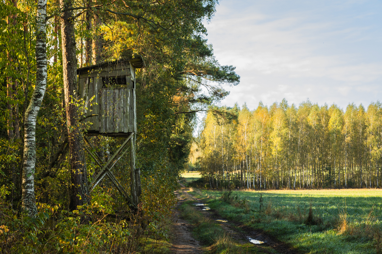 Hunting blind in Misty autumn forest. autumn in misty forest. Morning fog in autumn forest Poland Europe, Knyszyn Primeval Forest, birch trees, spruce trees, pine trees