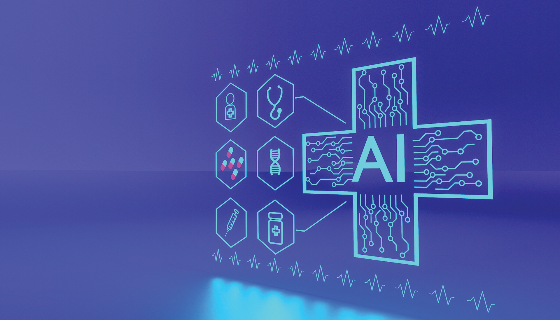 Digital graphic of AI in healthcare with a circuit styled medical cross and medical icons.
