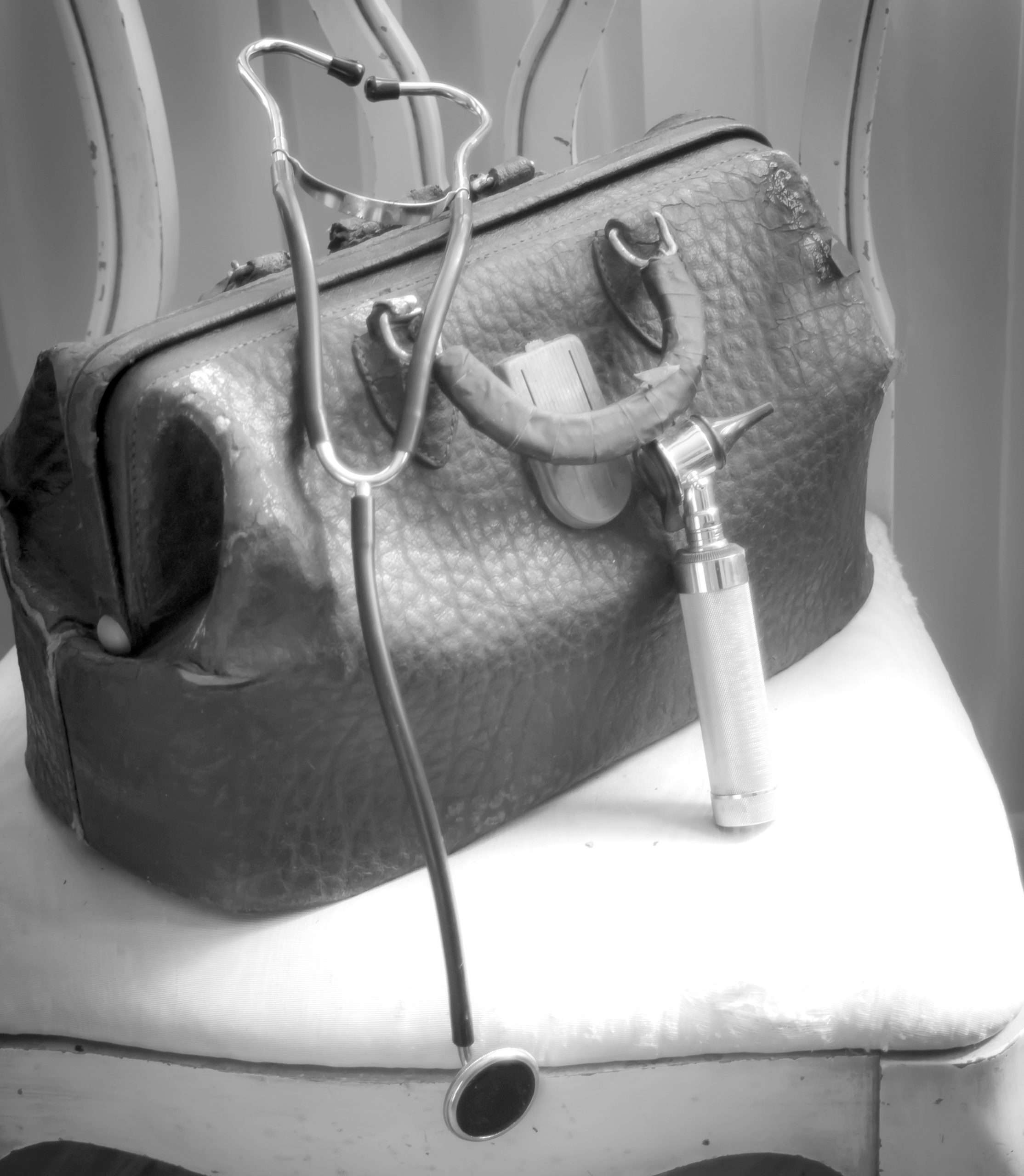 A worn old fashioned or vintage doctor's bag, stethoscope and otoscope on a worn chair.